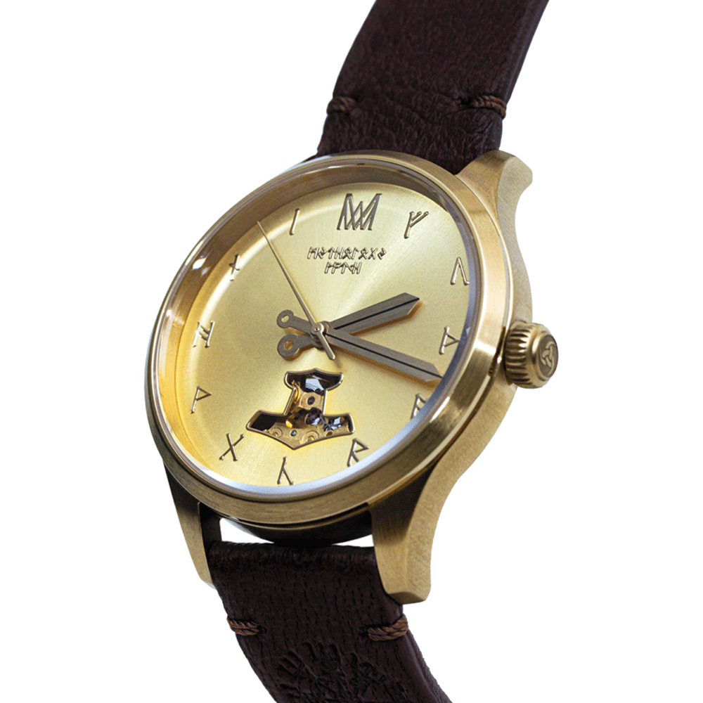 With its gold tones and brown leather strap, this watch embodies Tyr, the Norse god of war and justice. Gold signifies Tyr’s courage, strength, and prosperity, while the brown strap reflects his earthy roots and protective nature, creating a timepiece that symbolizes honor, resilience, and authority.